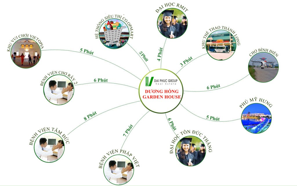 Với lợi thế nằm gần với trung tâm Nam Sài Gòn, kết nối thuận tiện đến các quận trung tâm. Nên quý cư dân sống tại Dương Hồng Garden House được thừa hưởng hệ thống tiện ích hiện hữu cao cấp như: